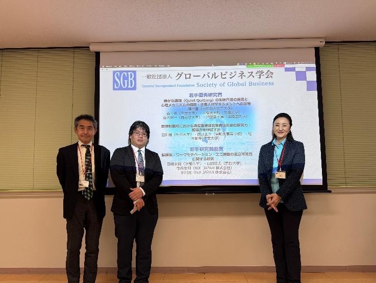 2025年度研究発表会では前年度に引き続き、若手研究者の研究促進を目的に若手研究セッションと関連する発表賞を設定しました。ここで若手研究者とは「大学院修士在学以上、かつ発表時に概ね40歳未満の研究者」を指し、グローバルビジネス学会の個人会員であることを原則としています。本研究発表会では若手研究セッションで5件の発表が行われ、平林実行委員長から以下の4名の若手研究者が表彰されました。